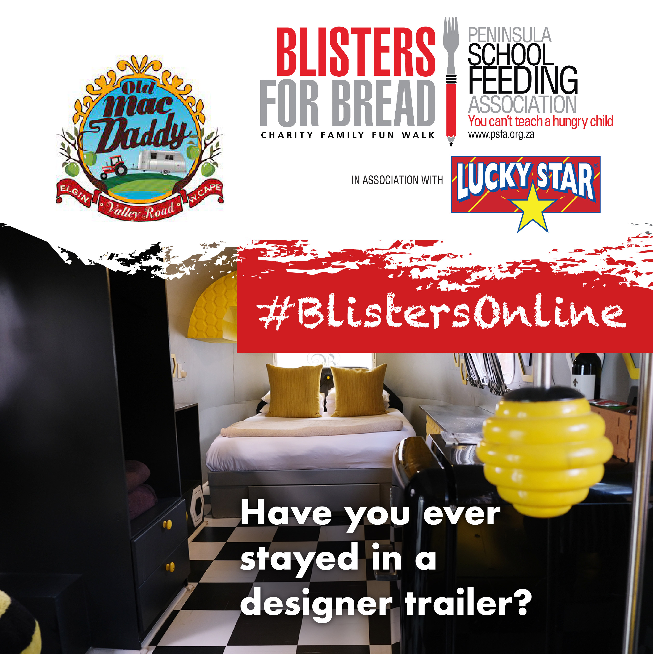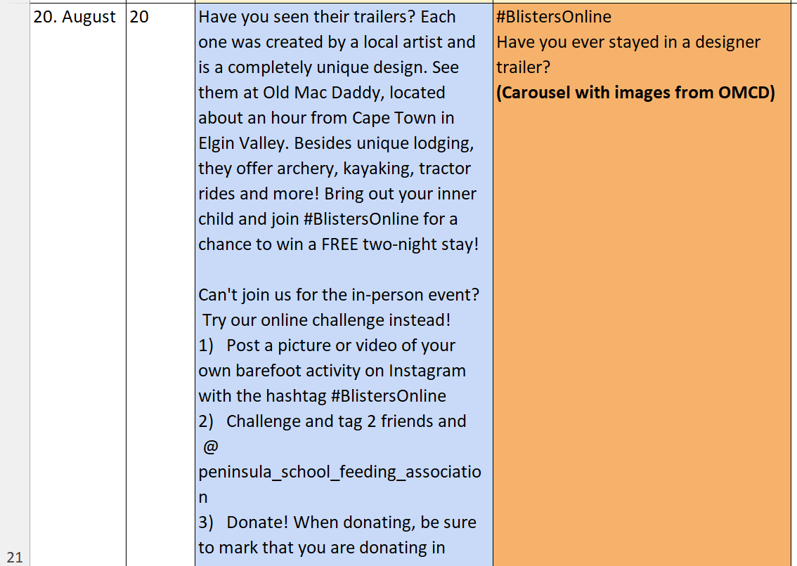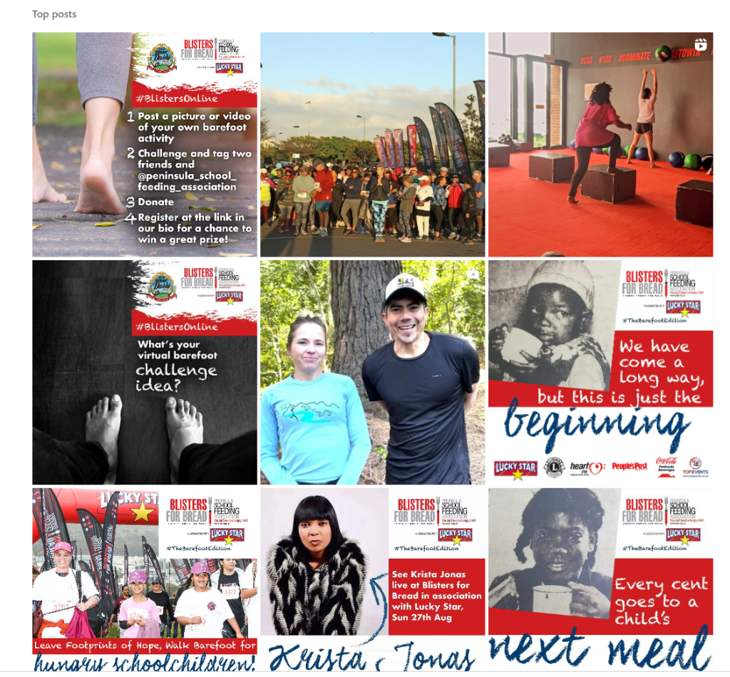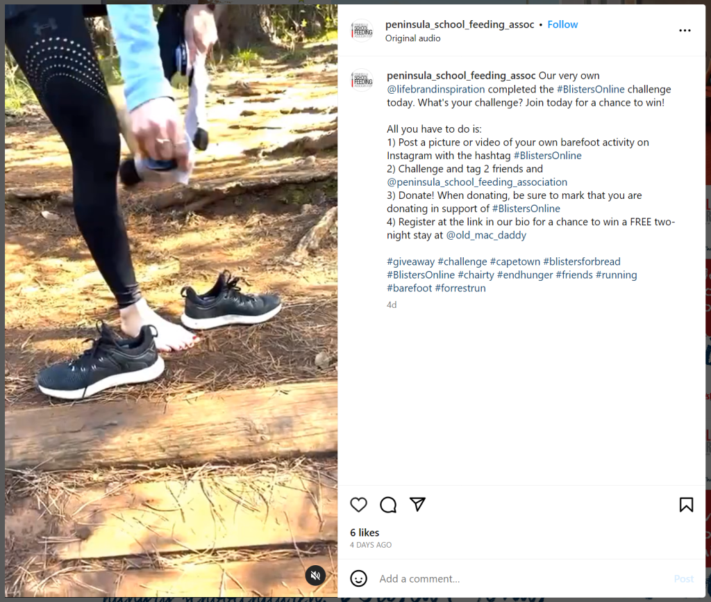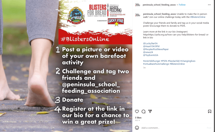 #BlistersOnline is an Instagram challenge that parallels the in-person charity walk Blisters for Bread. This year, participants in-person were challenged to walk barefoot, so #BlistersOnline asks participants to post their own barefoot activity and register on the PSFA website for a chance to win a free two-night stay at a local hotel. The campaign was launched in July 2023 and ends at the end of August 2023.