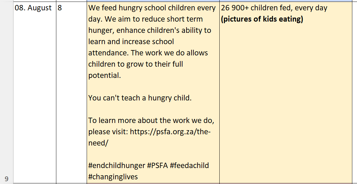 PSFA is the Peninsula School Feeding Association in Cape Town, South Africa. They feed over 26,000 impoverished children at school every day to help end child hunger and increase school attendance.