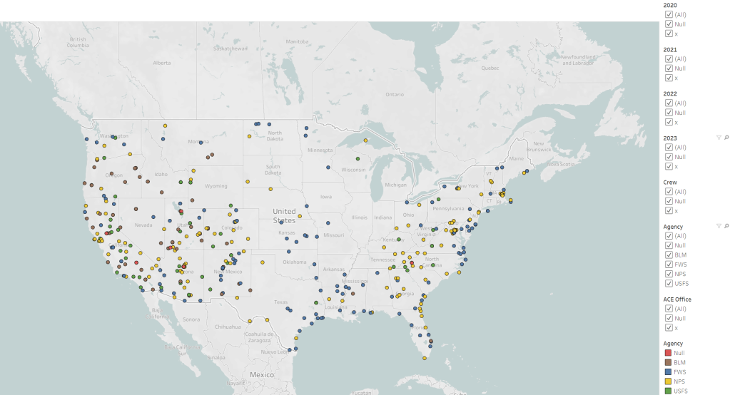 The goal was simple, to understand the physical distribution of work ACE has done post-pandemic for their four government partners; The National Park Service (NPS), The Bureau of Land Management (BLM), The United States Fish and Wildlife Service (FWS), and The United States Forest Service (USFS).